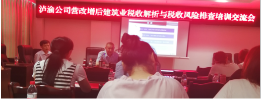 瀘州中匯金點(diǎn)稅務(wù)師事務(wù)所總經(jīng)理宋波于2018年6月28日在瀘渝公司主持了一場(chǎng)就營(yíng)改增后建筑業(yè)稅收解析與稅收風(fēng)險(xiǎn)排查培訓(xùn)交流會(huì),參加此次交流會(huì)的主要成員為瀘渝公司財(cái)務(wù)相關(guān)的所有成員共計(jì)二十八人。交流會(huì)主要從四個(gè)部分講解了營(yíng)改增后建筑業(yè)稅收解析與稅收風(fēng)險(xiǎn)排查問(wèn)題,第一部分的內(nèi)容是建筑業(yè)營(yíng)改增相關(guān)政策解析,第二部分的內(nèi)容是營(yíng)改增稅務(wù)風(fēng)險(xiǎn)點(diǎn)提示,第三部分的內(nèi)容是金三大數(shù)據(jù)框架下 稅收風(fēng)險(xiǎn),第四部分主要簡(jiǎn)單的介紹了 BT、BOT、PPP項(xiàng)目如何征收增值稅的問(wèn)題。 此次培訓(xùn),大家都積極的參加,積極的發(fā)表意見(jiàn)及問(wèn)題,通過(guò)此次培訓(xùn)活動(dòng),參加的人員普遍覺(jué)得培訓(xùn)效果好、收獲頗豐。