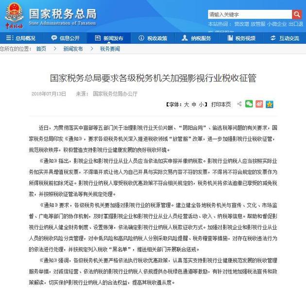 近日,國家稅務(wù)總局印發(fā)《通知》,進(jìn)一步加強影視行業(yè)稅收征管,規(guī)范稅收秩序,積極營造支持影視行業(yè)健康發(fā)展的良好稅收環(huán)境?!锻ㄖ分赋觯耙暺髽I(yè)和影視行業(yè)從業(yè)人員應(yīng)當(dāng)依法如實申報并繳納稅款。影視行業(yè)納稅人應(yīng)當(dāng)按照實際業(yè)務(wù)如實開具增值稅發(fā)票,不得填開或讓他人為自己開具與實際交易內(nèi)容不符的發(fā)票,不得將不符合規(guī)定的發(fā)票作為所得稅稅前扣除憑證?!锻ㄖ芬?,各級稅務(wù)機關(guān)要加強對影視行業(yè)的稅源管理。依法確定影視行業(yè)納稅人稅款征收方式。加強對影視企業(yè)和影視行業(yè)從業(yè)人員的稅收風(fēng)險分類管理,對存在稅收違法行為的依法進(jìn)行處理,并按規(guī)定列入稅收“黑名單”,推送相關(guān)部門開展聯(lián)合懲戒。