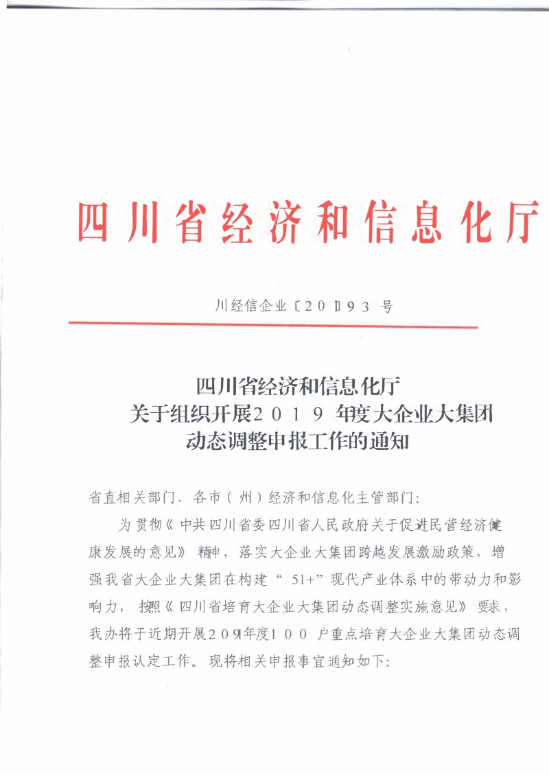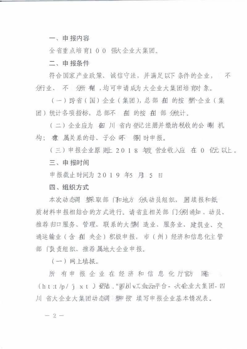 四川省經(jīng)濟(jì)和信息化廳 關(guān)于組織開展2019年度大企業(yè)大集團(tuán) 動(dòng)態(tài)調(diào)整申報(bào)工作的通知