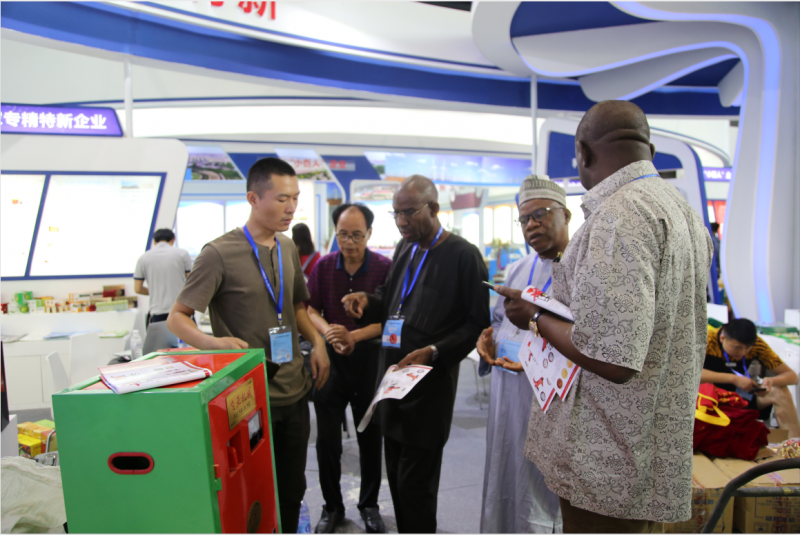 尼日利來采購商在井研飛來機械制造有限公司展區(qū)現(xiàn)場洽談采購業(yè)務(wù)。