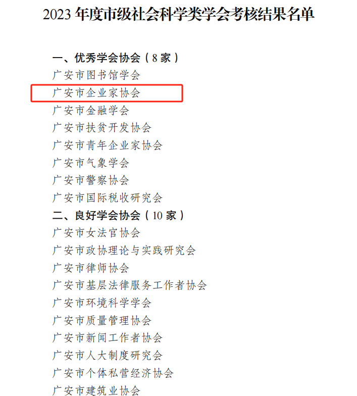 近日,市社會(huì)科學(xué)界聯(lián)合會(huì)發(fā)布通知,對(duì)2023年度學(xué)會(huì)協(xié)會(huì)工作先進(jìn)集體予以通報(bào)表?yè)P(yáng),廣安市圖書館學(xué)會(huì)等8家學(xué)會(huì)協(xié)會(huì)為優(yōu)秀,廣安市女法官協(xié)會(huì)等10家學(xué)會(huì)協(xié)會(huì)為良好,廣安市糧食行業(yè)協(xié)會(huì)等4家學(xué)會(huì)協(xié)會(huì)為合格。其中廣安市企業(yè)家協(xié)會(huì)榜上有名,獲評(píng)2023年優(yōu)秀協(xié)會(huì)。